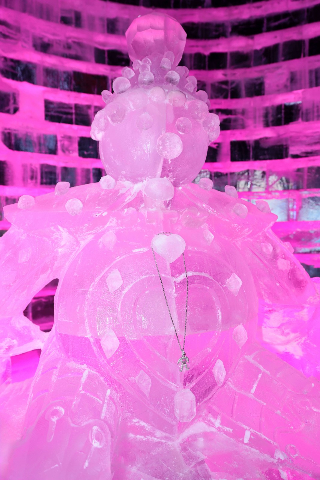 冰雕入口处,以Chopard萧邦经典的Happy Clown系列为灵感打造的“小丑”冰雕置身梦幻景致之间。作为Chopard萧邦联合总裁兼艺术总监卡罗琳·舍费尔(Caroline Scheufele)创作的首件珠宝及品牌珠宝的开山之作,这一承载其无尽创意的经典符号,如今于皑皑冰雪中焕发新生,以灵动姿态传递着悦然无拘的“乐享生活”理念。步入冰雕之内,另一尊“小丑”冰雕于光影深处温暖相迎,其胸前勾勒精致爱心轮廓,以妙然童趣点亮冬日愉悦光景与新年希冀。